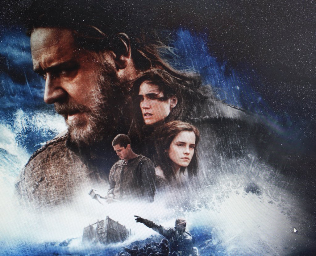 De gamla bibliska patriarkerna och profeterna levde i en intim dialog med Gud, en kanal som ständigt stod öppen i ett levande samtal. För att göra sin film har regisören Darren Aronofsky lagt in ett avstånd i den dialogen genom att konsekvent tala om skaparen i stället för Gud eller Herren och Noah har drömmar och fantasier i stället för tilltal från Gud, som blir lite mer oklara. Det ger utrymme för flera tolkningar av det som Noah uppfattar som komna från skaparen. Detta filmtekniska knep öppnar för Darren Aronofsky att skapa fritt. Filmen är inspelad på Island och har fått en budget på 1 miljard kronor. Filmen byggger på en manus från Darren Aronofsky och John Logan och i filmmanuset finns Ari Handel med som medförfattare. Noah spelas av Russell Crowe och hans fru av Jennifer Connelly. Filmen är förstås på engelska och då blir stavningen på huvudrollen Noah. Denna osäkerhetsfaktor i kontakten med skaparen gör också att Noah kan bli osäker på på vad skaparen vill. Före avfarten med den stora båten hittar Noah en flicka bland en skara döda människor efter någon naturkatastrof. Det visar sig vara ett svårt skadat flicka och därav infertil, tolkar Noah det som att skaparen inte gett familjen någon möjlighet att föröka sig. Därmed blir uppdraget för Noah att forsla djuren över vattnet och sedan har Noahs familj gjort sitt och alla kommer att dö i tur och ordning. Noah har ju med sig sina tre söner Sem, Ham och Jafet utan fruktsamma svärdöttrar och då är loppet kört för Noah. I den bibliska berättelsen är det klart att Noah har funnit nåd inför Gud som en rättskaffens man och han känner sig utvald att med djuren få överleva katastrofen. Frågan om fortsatt förökning tas inte upp i bibeln. Ett underverk låter Aronofsky hända då han i ett av människan förstört landskap låter ett frodigt stort skogsparti växa upp på nolltid , för att Noah skall få virke för sin ark. Bygget sätts igång. En stor folkgrupp från Kains släkt dyker upp och pockar på att få följa med. Det blir en häftig kamp mellan Noah och Kains släkt. Storvuxna väktare, som är någon form av fallna änglar med flera armar och stora och byggda i stenblocksliknande kroppar, som de vore doppade i tjära och stora som tvåvåningshus hjälper Noah i striden, men ledaren lyckas gömma sig i arken. I bibeln är reaktionen från omgivningen mer hån och förakt för Noahs vilda fantasier. Folk tror inte på honom. Alla djuren väller in, först fåglar och sedan kräldjur i datoranimerade former. Sist de stora benburna djuren. Väl inne i arken ser vi så gott som ingenting av dem under hela färden. Inte heller ett maffigt uttåg från arken efter landningen på berget Ararat finns med. Dramat fokuseras på det psykologiska spelet i Noahs familj. I filmen skapas ett familjedrama kring familjemedlemmarnas egen överlevnad. Den ofruktsamma Ila hinner innan avfärden ta sig iväg till farfadern Lemek och han ger henne sin välsignelse, som också innebär att hon får sin fertilitet tillbaka. Ila och Sem fann varandra tidigt i filmen och de blir ett par och Ila blir gravid under färden med arken. Då Noah redan låst sig i tanken att hans familj skall dö, för att skaparen inte vill ha med människorna i sin värld, så hotar Noah att döda barnet om det blir en dotter. Noahs hustru och Ila samt Sem kämpar en hård kamp mot Noah, som blir en envis ilsken tankemässigt fastlåst gubbe, som skall uppfylla uppdraget till varje pris, dvs så som han uppfattat det. Hur det går kan jag lämna till den som inte sett filmen att få uppleva. Intrycket är att Aronofsky skapat en film, som hamnat ganska långt ifrån berättelsens ursprung i Gamla Testamentet. Detta för att få det drama han velat skapa. Det finns frågor om människans ansvar för planeten och ondskan som förstör både människor, natur och djur och vårt ansvar inför det. Själv är Noah vegan för att göra sitt bidrag. Den som inte är välbekant med bibelns version kan ha lättare att köpa upplägget. Filmen fick kalla handen från Vatikanen som kallade den ”ett förlorat tillfälle” och ”en Noah utan Gud”.