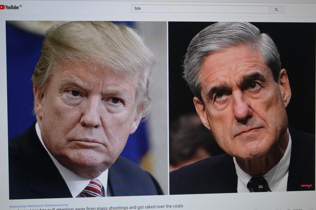 Till vänster mötet mellan Donald Trump och Vladimir Putin i Helsiknki. Till höger Donald Trump och Robert Mueller.